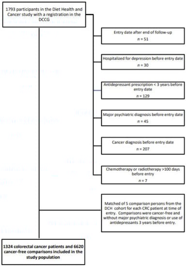 All participants in the study were followed from either the date of diagnosis of colorectal cancer or study entry for the matched comparison persons until date of hospitalization for depression or date of first redeemed prescription of an antidepressant, date of hospitalization for other major psychiatric event, diagnosis of a new primary cancer or a cancer diagnosis in the comparison person, emigration, death, or end of follow-up (31 December 2016), whichever came first.