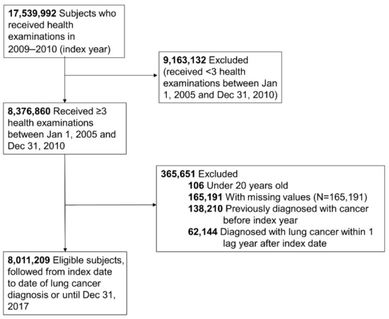 In our study, we included those who received a health examination between 2009 and 2010 (index year) and two or more health examinations within the previous 5 years from the index year. Of the 17,539,992 people eligible for a health examination in the index year, 8,376,860 received over three health examinations during the period described. We excluded those under 20 years old, those who had missing data for the variables studied (n = 165,191), those with a previous diagnosis of cancer (n = 138,210) before the index date, and those diagnosed with lung cancer within 1 year after the index date (n = 62,144) for 1 year of lag time. Ultimately, the study population included 8,011,209 subjects (Figure 1). This study was conducted in accordance with the amended Declaration of Helsinki, and received approval by the Institutional Review Board of Samsung Medical Center (IRB No. SMC 2019-07-031), and the need for informed consent was waived because we used deidentified data for our analysis.