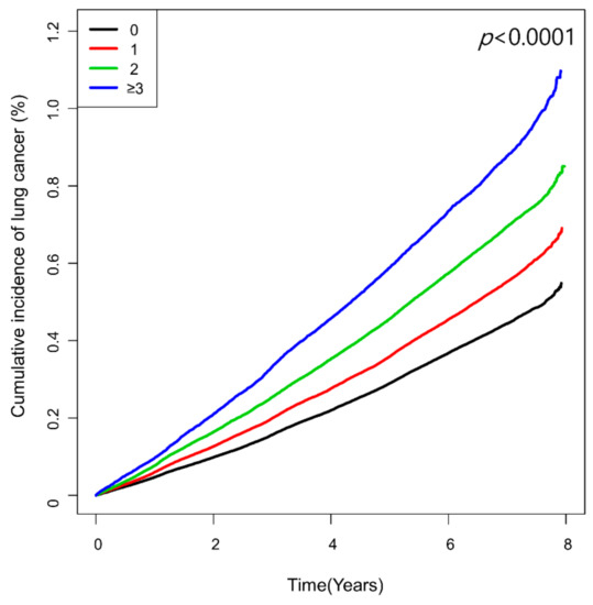 On the other hand, metabolic parameters fluctuate over time, and these fluctuations do not occur at random and are consistent within an individual [12,13]. Recent studies have shown that, even after adjusting for mean levels of the metabolic parameters, variability in fasting blood glucose (FBG) [14], weight [15], systolic blood pressure (SBP) [16], and total cholesterol (TC) [17] are independent risk factors for all-cause mortality [14,15,16,17] and cardiovascular events [16,17]. In addition, previous studies have demonstrated an association between variability in metabolic parameters and cancers, such as hepatocellular carcinoma [18,19], and multiple myeloma [20]. Metabolic derangements, inflammatory pathways [18], insulin resistance [21], and shortening of telomeres [22] were suggested as possible underlying mechanisms. Regarding lung cancer, the Iowa Women’s Health Study suggested a positive association between weight variability and lung cancer risk [23]. However, the association became non-significant after adjusting for health risk factors such as smoking, and the study was confined to women. Metabolic risk factors tend to cluster and have been suggested to comprise a syndrome; therefore, their variability may interact in an additive manner to exert a greater impact on health [24]. However, to the best of our knowledge, no studies have examined the additive effects of metabolic parameter variability on lung cancer risk, and the variability of other metabolic parameters besides weight, such as SBP, FBG, and TC levels, have not yet been studied with a focus on lung cancer.