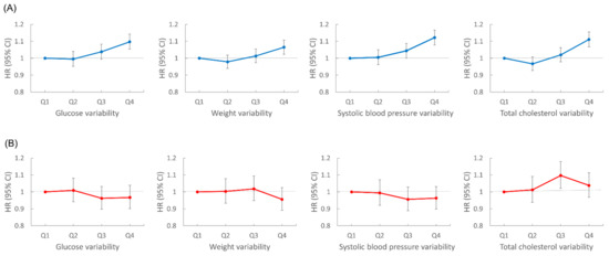 Sex stratified analyses of lung cancer risk according to variability of metabolic parameters. All hazard ratios (HR) are adjusted for age, alcohol consumption, smoking, regular exercise, household income, baseline fasting blood glucose, total cholesterol, systolic blood pressure, and body mass index. (A) Risk of lung cancer in men according to glucose, weight, systolic blood pressure, and total cholesterol variability. (B) Risk of lung cancer in women according to glucose, weight, systolic blood pressure, and total cholesterol variability.