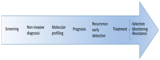 ctDNA represents less than 1% of all cfDNA. Its half-life is very short, since it is degraded by nucleases and eliminated through the urinary tract. Its concentration depends on the tumor volume, being detected more frequently in advanced tumors than in the early stages. All this makes its detection in early stages a technological challenge [93].