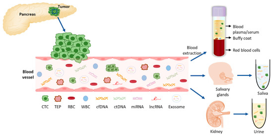Liquid biopsy components in PDAC. Tumor cells (CTCs) are shedded from the tumor into the blood vessels where they can release their components: nucleic acids and exosomes with tumor-specific cargo material. For the analysis of these molecules, blood can be extracted and plasma or serum further processed for the extraction of the desired components. From the blood circulation, these molecules can be filtered to saliva and urine which can also be collected and further analyzed. CTC: circulating tumor cell; TEP: tumor educated platelet, RBC: red blood cell; WBC: white blood cell; cfDNA: cell-free DNA; ctDNA: circulating tumor DNA; miRNA: micro RNA; lncRNA: long non-coding RNA.