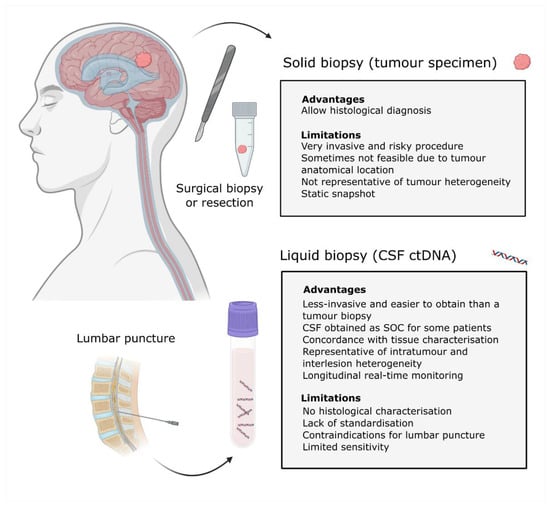 Solid vs. liquid biopsies. Schematic representation of the tumour biopsy and CSF samples obtained from a patient with a CNS malignancy. Advantages and limitations for each methodology are indicated. Definition of acronyms: standard of care (SOC), cerebrospinal fluid (CSF), circulating tumour DNA (cfDNA) and central nervous system (CNS).