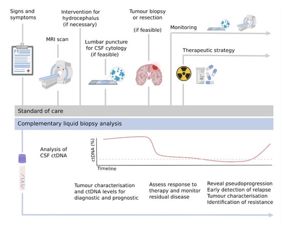 A liquid biopsy of CSF can characterise the tumour for diagnosis and provide prognostic information, also complementing the information obtained from the tumour sample if a biopsy or resection is feasible (Figure 1). During patient follow-up, it could be used to monitor the response to treatment through the levels of ctDNA and the detection of minimal residual disease. Importantly, it can facilitate early detection of relapse and identify therapeutic targets or mechanisms of resistance in order to adjust the therapeutic strategy at relapse (Figure 2).