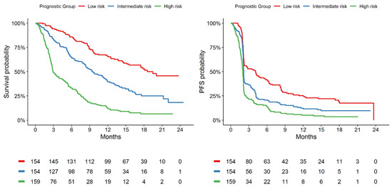 On the basis of these observations, the GBM model built with the curated list was selected for further evaluation as it provided the highest and most consistent discrimination performance among the evaluated ML algorithms. On validation, the GBM model (curated-list version) was observed to be well-calibrated for OS and PFS prediction (Figure S2). The GBM model (curated-list version) was observed to discriminate 1-year OS probabilities of 66%, 40%, and 12% for the the low-, intermediate-, and high-risk groups, respectively, defined from the randomised atezolizumab patients of IMvigor211, while 1-year PFS probabilities of 25%, 12%, and 5% were observed for the defined risk groups (Table 2). Kaplan–Meir plots of OS and PFS probabilities are presented in Figure 2.