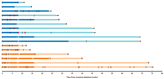 All 6 patients who initiated trametinib as a monotherapy added on low-dose dabrafenib at the time of treatment-limiting skin toxicity (after a median of 3.1 weeks [range 2.9–5.0] of trametinib monotherapy) (Figure 2). Two patients were in need of a dabrafenib treatment interruption (dabrafenib was always interrupted together with trametinib), one patient required a dabrafenib dose reduction. The median daily dose of dabrafenib was 100 mg (range 85.2–100.0; 93% dose intensity). Among the subsequent 10 patients who initiated trametinib and low-dose dabrafenib together, the median daily dose of dabrafenib was 68.8 mg (range 47.8–100.0; 73% dose intensity). Four out of ten patients required a dabrafenib dose reduction.