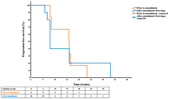 Progression-free survival curve and life table in the first six patients enrolled prior to trial amendment (orange) and in the ten patients enrolled after trial amendment in the first stage of the study (blue).