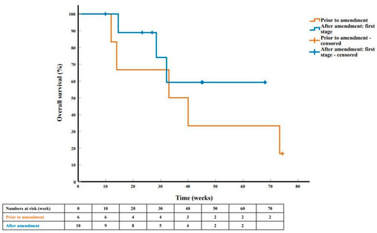 Overall survival curve and life table in the first six patients enrolled prior to trial amendment (orange) and in the ten patients enrolled after trial amendment in the first stage of the study (blue).