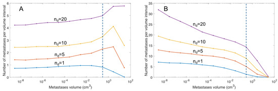 The metastatic distribution for different metastatic formation rates (A) c = 0.16% d−1g−1 (B) c = 2.56% day−1g−1. The dashed blue line indicates the assumed detection limit of metastases, equal to 7 mm. The blue, red, yellow and magenta lines show the metastatic distribution for 1, 5, 10, and 20 detectable metastases (nd), respectively.
