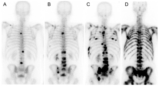 Bone scans performed with [99mTc]Tc-phosphonate in prostate cancer patients. (A) Initial patient scan visualizing well-defined oligo metastases. (B,C) At later time points, 400 days after initial scanning (B) and 800 days after initial scanning (C), the number of well-defined metastases increased despite continued systemic treatment; (D) A typical patient with diffused visualized metastases in the skeleton.