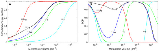 The electron emitter yttrium-90 was determined to have high absorbed energy in large spheres, but substantially less absorbed energy for small tumors (Figure 4). However, if the activity concentration is high in surrounding tissue, the cross-irradiation from the normal tissue can sterilize the smallest tumors. Figure 4B illustrates this fact for a TNC of 10, i.e., TCP increase for decreased tumor sizes (<10−6 cm−3). These small tumors can receive increased absorbed energy/decay with iodine-131, but the energy absorbed in small tumors is increased further when using lutetium-177. An even higher absorbed energy/decay could be obtained with terbium-161, which has the lowest variation in absorbed energy/decay for the various spheres. This property is an explanation of the high TCP values for terbium-161 over a wide range of sphere sizes (Figure 4B).