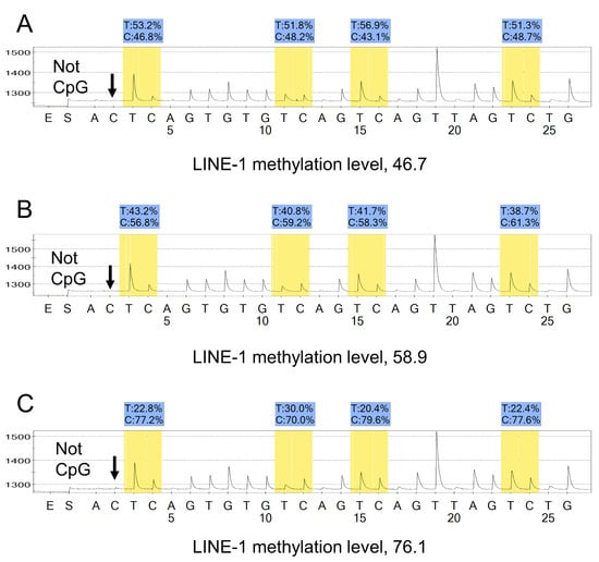 Pyrosequencing assay to measure LINE-1 methylation. (A) Tumor with LINE-1 hypomethylation (methylation level of 46.7). (B) Tumor with LINE-1 methylation level of 58.9. (C) Tumor with LINE-1 methylation level of 76.1. In panels A–C, the % numbers (in blue shade) are proportions of T and C nucleotides at each CpG site after bisulfite conversion. The proportion of C nucleotides (%) can be interpreted as the methylation level of each CpG site. The first, third, and fourth CpG sites follow mononucleotide T repeats, resulting in higher T peaks (in yellow shade) than the second CpG site. Accordingly, the proportion of C nucleotides (%) has been adjusted. No residual C nucleotides at the non-CpG site are indicated by the arrows, providing evidence for a complete bisulfite conversion reaction. We used the average of the proportions of C nucleotides at the 4 CpG sites as the LINE-1 methylation level (a scale of 0 to 100) of each tumor. To avoid confusion with other % numbers, “%” is not used for this LINE-1 methylation level to keep consistency between the text, tables, and figures. Abbreviation: LINE-1, long interspersed nucleotide element-1.