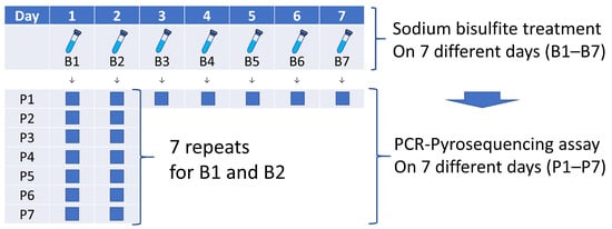 Validation procedure to assess precision of bisulfite conversion and PCR-pyrosequencing. Bisulfite conversion was performed on seven aliquots (B1 to B7) from each specimen. PCR-pyrosequencing was performed for seven bisulfite-treated specimens (B1 to B7) and was repeated seven times on two specimens (B1 and B2) on seven different days (P1 to P7). Abbreviation: PCR, polymerase chain reaction.