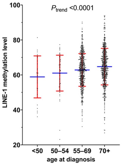 The following available online at https://www.mdpi.com/article/10.3390/cancers13092016/s1, Table S1: LINE-1 methylation level of colorectal cancer cases according to age at diagnosis, Table S2: Linear regression analysis to predict LINE-1 methylation level (outcome) by four age groups (predictor) using indicator variables for missing data.