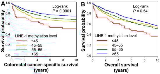 Kaplan–Meier survival curves of colorectal cancer-specific survival (A) and overall survival (B) according to the LINE-1 methylation level. The p values were calculated using the log-rank test for trend (two-sided).