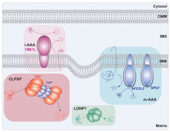 Schematic representation of mitochondrial ATP-dependent proteases. Mammalian mitochondria comprise four different proteases of the AAA+ superfamily for regulating protein quality control: The ClpXP complex and Lon protease 1 in the matrix and the i-AAA and m-AAA proteases in IM. Abbreviations: IMM, inner mitochondrial membrane, OMM, outer mitochondrial membrane; IMS: intermembrane space.