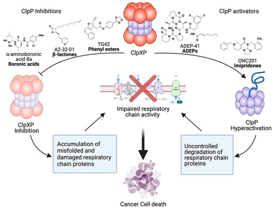 ClpXP inhibition and hyperactivation lead to cancer cell death. Genetic and chemical inhibition of ClpXP leads to the accumulation of misfolded and damaged respiratory chain proteins and impairs oxidative phosphorylation which results in selective cancer cell death. ClpP chemical activators and mutated hyperactive ClpP result in uncontrolled degradation of ClpP substrates. ClpP hyperactivation causes mitochondrial morphological damage and decreased oxidative phosphorylation, which also results in cancer cell death.