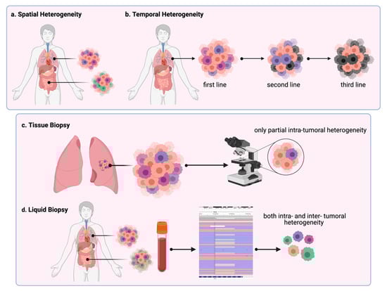 Tumor heterogeneity. Levels of heterogeneity: (a) different subclones in the primary tumor and metastasis define the spatial intra- and inter-tumoral heterogeneity; (b) differences among the primary tumor and tumor evolution after first, second, and third-line therapy and among metastases constitute temporal heterogeneity; (c) tissue biopsy performed on the primary tumor allows the assessment of only partial intra- and inter-tumoral heterogeneity; (d) liquid biopsy and sequencing allow detection of both the spatial and temporal tumor heterogeneity.