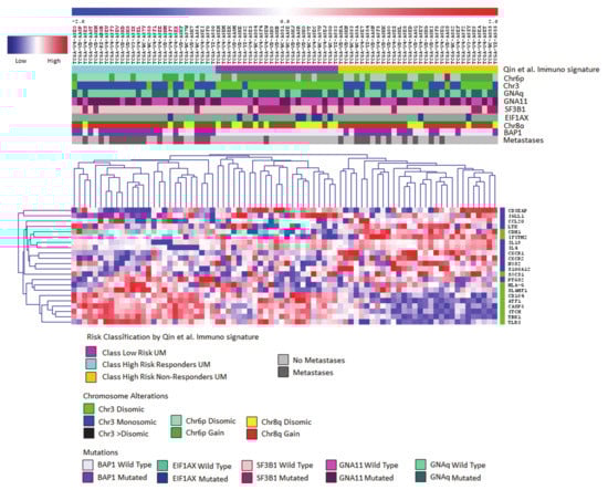 Patel’s group recently proposed a study on a dataset of 47 P- and M-UM demonstrating, by IHC, that metastatic patients show significantly higher levels of immune infiltrate (CD3+, CD8+, FoxP3+, and CD68+ cells) compared to primary tumors [60]. They developed an IFN-γ signature using Nanostring technology between 2 responder and 4 non-responder patients to immunotherapy. Their data indicated that pre-treatment tumors of non-responders display a gene expression profile consistent with pro-inflammatory signaling, while responders have significantly elevated levels of Suppressor Of Cytokine Signaling 1 (SOCS1) and HLA molecules. Two sets of genes that are differentially expressed between responders and non-responders were identified. Twelve genes were upregulated in responders at baseline before treatment and 13 showed significantly higher expression at baseline in non-responders. The authors identify, for the first time, a baseline tumor immune signature predicting response and resistance to immunotherapy in UM, that can be used to select those patients that are likely to respond to immunotherapy. A limit of this signature is the small number of patients (n = 6) analyzed. However, results from validation studies of this signature in larger cohorts of patients (GEM1402 and CA184-187) will provide more information on the resistance and response mechanisms of M-UM to immunotherapy, and prospective testing will establish clinical value. Figure 1 shows the application of this signature to the TCGA dataset of P-UM. The hierarchical clustering of this signature highlights three main clusters: high-risk with an immunotherapy responder profile (light blue), low-risk (pink), and high-risk non-responders (yellow). Among the high-risk UM, mostly metastatic cases with BAP1 mutations, chromosome 3 monosomy, and chromosome 8q gain, 1 group (light blue) contains potential responders to immunotherapy.