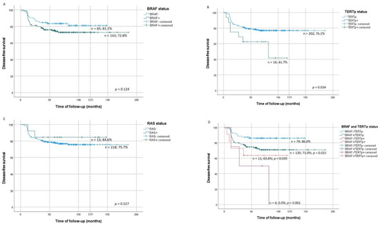 At 10-year evaluation, recurrent/persistent DFS was significantly lower in patients with TERTpmut tumors (41.7%, p = 0.034). Patients with TERTpmut tumors presented 2.3 times increased risk of recurrent/persistent disease (p = 0.04), but this association was lost when the model was adjusted for age and gender (p = 0.062) (Table 3). Recurrent/persistent DFS was not significantly different in patients with BRAFmut or RASmut tumors from patients with BRAFwt or RASwt tumors (Figure 1A–C; Table 2). Considering concomitant mutations, at 10-year evaluation, recurrent/persistent DFS was significantly lower in patients with BRAFmut/TERTpwt (log-rank p = 0.021), BRAFmut/TERTpmut (log-rank p = 0.035) and BRAFwt/TERTpmut (log-rank p = 0.001) tumors than in patients with BRAFwt/TERTpwt tumors (Figure 1D). The aforementioned concomitant mutations significantly increased the risk of recurrent/persistent disease in comparison to BRAFwt/TERTpwt tumors (Table 3).