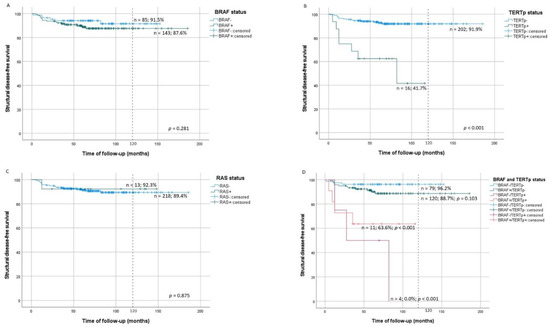The following are available online at https://www.mdpi.com/article/10.3390/cancers13092048/s1, Figure S1: Kaplan–Meier curves of recurrent/persistent disease-free survival by concomitant BRAF and TERT promoter mutations in comparison to tumors mutated only for BRAF (E) and only for TERTp (F). Figure S2: Kaplan–Meier curves of structural disease-free survival by concomitant BRAF and TERT promoter mutations in comparison to tumors mutated only for BRAF (E) and only for TERTp (F). Figure S3: Kaplan–Meier curves of disease-specific survival by concomitant BRAF and TERT promoter mutations in comparison to tumors mutated only for BRAF (E) and only for TERTp (F). Table S1: Univariate analysis of clinicopathological features and combined gene mutations. Table S2: BRAF, TERTp, and RAS molecular status in lymph node metastases at diagnosis, locoregional recurrences, and distant metastases and distribution in the different PTC variants.