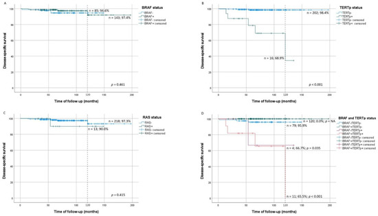 Kaplan–Meier survival curves of PTC disease-specific survival (DSS) by tumor molecular status in comparison with wild type tumors; (A) BRAF status, (B) TERTp status, (C) RAS status, (D) combined BRAF and TERTp status in comparison to wild-type tumors; wt: wild-type; mut: mutated.