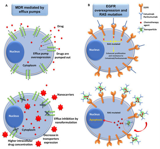Representative scheme of nanomedicine strategies against drug resistance in pancreatic cancer. (A) Interactions of nanoformulations with MDR mechanism in pancreatic cancer (PAC) cells. Drugs carried by NPs may overcome MDR mechanisms of PAC cells mediated by efflux pumps via the inhibition of drug efflux, decrease in the expression of the transporter proteins, and increased accumulation of drug inside the tumor cells. (B) Exploiting the overexpression of EGFR to overcome resistance mediated by RAS mutations in PAC cells. PAC cells overexpress EGFR, which can be targeted by NPs conjugated with mAbs (Cetuximab/Panitumumab) (see below). This enables increased internalization of the chemotherapy drugs, thus leading to cellular apoptosis, even in RAS-mutated cancer cells.
