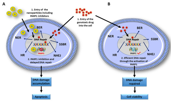 Nanoformulations to fight against drug resistance induced by PARP1. PARP1 modulates DNA damage repair by single-chain (SSBR, BER and NER) and double-chain (HR and NHEJ) repair pathways. PARP inhibitors are used to avoid drug resistance by limiting PARP1 functions in the different DNA repair pathways in which this protein is involved and therefore nanoformulations containing PARP inhibitors have been designed for different types of cancer. (A) The simultaneous entry of nanoparticles containing PARP1 inhibitors together with the genotoxic drug causes the inactivation of PARP1, necessary for the efficient repair of DNA damage through all the routes in which it is involved. This causes that the damages produced by the genotoxic agent in the DNA are not repairable, inducing cellular apoptosis.; (B) Entry of the genotoxic agent into the cell produces easily repairable DNA damage through DNA repair pathways where PARP1 acts as an important effector, leading to cell survival. Abbreviations: homologous recombination (HR).