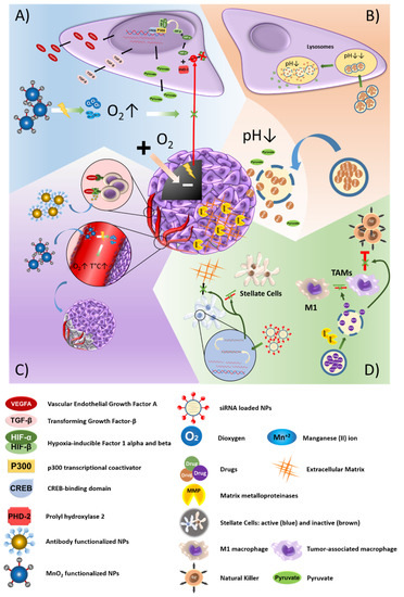 Nanoparticle-based strategies to exploit the characteristics of the tumor microenvironment (TME). (A) Systems that focus on the presence of hypoxic areas are based on the generation of oxygen, increasing its local levels and, therefore, eliminating the stress situation which results from hypoxia. Reversal of the hypoxic state blocks the expression of HIF-1α and, consequently, reduces the acidification of the extracellular medium and the expression of pro-angiogenic factors. (B) Medium acidification can be exploited by using pH-sensitive nanoplatforms with the aim of both achieving a controlled release of their load and buffering the medium to reestablish the pH. (C) Some strategies also focus on the active targeting of the neo-vasculature through the use of NPs that specifically recognize it by means of antibodies and the application of radiation. (D) In addition, some cellular components of the TME can be reprogrammed by using certain drugs, or inactivated by vehiculation of siRNA.