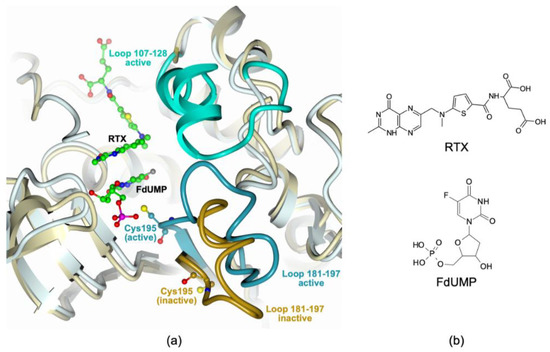 (a) Least-squares superposition of hTS in the active (light cyan ribbons; hTS:FdUMP:RTX complex, PDB id: 6ZXO) and inactive (light gold ribbons, PDB id: 3N5G [33]) conformations. The structured loop (residues 181–197) is shown as either a dark cyan or a dark gold rope for the active and inactive conformer, respectively. The different orientations of the catalytic Cys195 residues, represented as balls and sticks, can be appreciated. When the 181–197 loop is in the active conformation, loop 107–128 is structured (cyan rope) whereas it is disordered, thus not visible, when loop 181–197 is in the inactive conformation. The FdUMP and RTX molecules, bound to the “closed” active site, are represented as balls and sticks (green carbons). Oxygen atoms are colored red, nitrogen blue, sulfur yellow, phosphorous magenta, and fluorine gray. (b) Chemical structures of RTX and FdUMP.
