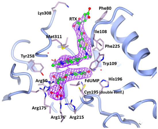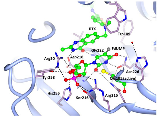 The available structures include three ternary complexes of hTS with dUMP and RTX (PDB: 1HVY [15], 1I00 [32], 5X5Q [35]) as well as the corresponding ternary complexes in which RTX is replaced by methotrexate (MTX, PDB: 5X66 [35]) or an RTX analog (PDB: 5X67 [35]). They are all very similar, the main difference is in the hTS:dUMP:RTX ternary complex (PDB: 1HVY), in which dUMP is covalently bound to the catalytic Cys195 [15].