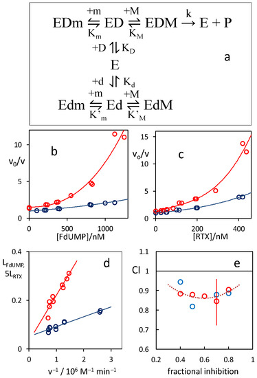 (a) Kinetic scheme for the inhibition of hTS (E) by FdUMP (d) and RTX (m); D represents the dUMP substrate, M the mTHF cofactor; (b,c) blue symbols: single-inhibitor Dixon-type plots for FdUMP (b) and RTX (c) alone; red symbols: Dixon-type plots for the inhibition by combinations of FdUMP with RTX 120 nM (b) and of RTX with FdUMP 450 nM (c). vo (rate without inhibitors) = 16 μM min−1. The curves only represent exponential-function fittings of the data. (d) Tight-binding analysis of the single-compound inhibition data of hTS by FdUMP (red symbols, LFdUMP) and RTX (blue symbols, 5 LRTX). v is the reaction rate, LFdUMP and LRTX are the left members in Equations S1 and S2 in the Supplementary Information. The values of LFdUMP reported in the plot were calculated assuming KM’ = 5 KM. (e) Isobologram showing the combination indexes (CI, see the text) for RTX/FdUMP combinations giving the fractional inhibitions (fi = 1 − v/v0) reported. Blue circles: [FdUMP] = 450 nM, [RTX]/nM = 55 (fi = 0.4), 70 (fi = 0.5), 120 (fi = 0.6), 180 (fi = 0.7), 260 (fi = 0.8); red circles: [RTX] = 120 nM, [FdUMP]/nM = 100 (fi = 0.4), 300 (fi = 0.5), 450 (fi = 0.6), 650 (fi = 0.7), 1000 (fi = 0.8). The curve is just a quadratic-function fitting to the CI/fract.inhib. data points. A typical estimated error bar is shown.