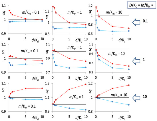 Synergism quotients (sq) calculated for the kinetic scheme in Figure 4a in the cases of simultaneous binding of the two inhibitors (m and d, red symbols) and in the case of mutual exclusivity of the inhibitors (blue symbols) for several choices of i/Ki ratios (from the top, 0.1, 1, and 10). The black line separates the synergistic (sq > 1) from the antagonistic values (sq < 1).