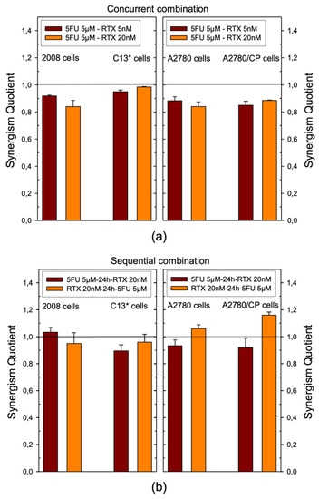 We have investigated the inhibitory effects of combinations of RTX and 5FU, with varying administration schedules, on the growth of four human ovarian cancer cell lines, 2008, C13*, A2780, and A2780/CP. These cells were either simultaneously exposed to RTX and 5FU for 72 h, or sequentially exposed to RTX for 24 h and then to RTX and 5FU for additional 48 h, or vice versa. The drug concentrations used in the combinations were based on the IC50s. These are reported in Table S3 of the Supplementary Information. The effects of binary combinations were determined with both drug concentrations lower than their IC50s and were characterized in terms of the synergism quotient [26,27,28]. The best results were achieved with 1:1000 or 1:250 RTX:5FU ratios, with 5 μM 5FU and either 5 or 20 nM RTX. With 5 μM 5FU alone, cell growth inhibitions were 24.7, 21.2, 28.3, and 27.1% for 2008, C13*, A2780, and A2780/CP, respectively. Analogously, 5 and 20 nM RTX alone inhibited the growth of these cells by 32.9 and 36, 26.4 and 31.2, 26.0 and 29.1, 24.5 and 25.2%, respectively (Table S4). The experiments indicated that the cytotoxicity of RTX and 5FU combinations were schedule dependent. In most cases, a simultaneous exposure to RTX and 5FU showed sub-additive or slightly antagonistic effects on all four cell lines, with synergism quotient (sq) values between 0.84 and 0.98. C13* cells were almost additively killed by 5µM 5FU simultaneously administered with 5 and 20 nM RTX: sq = 0.95 and 0.98 (Figure 6a, Table S4).