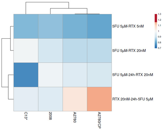 Heatmap representation of the synergism quotient values of the tested RTX-5FU combinations (rows) against the different cell lines (columns). Color code: red: sq > 1; blue: sq < 1. The data are reported in Table S4 of the Supplementary Information.