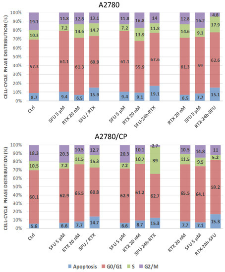 We can conclude that additive cell cycle perturbation can be observed in the case of A2780 cells treated with the sequential schedule with RTX administered first. This was more evident in sensitive (A2780) than in resistant cells (A2780/CP) where the opposite administration sequence was more effective in causing the S phase block.