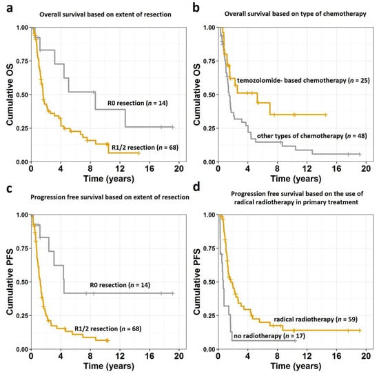- Gupta, S.; Mallick, S.; Benson, R.; Haresh, K.P.; Julka, P.K.; Rath, G.K. Extent of surgical resection and adjuvant temozolomide improves survival in pediatric GBM: A single center experience. Childs Nerv. Syst. 2017, 33, 951–956. [Google Scholar] [CrossRef]