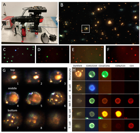 Microscopy system and example images of PBMC from a healthy control. (A) Combined automated darkfield and epi-fluorescence microscope developed for the project. (B) Maximum-intensity projection of the z-stack darkfield image of a field of view. Some cells show PNPs bound to them. (C) First fluorescent channel showing all PBMC in green (CD45) and B cells in blue (CD19). (D) Second fluorescent channel showing monocytes in green (CD14) and NK cells in orange (CD56). (E) Third fluorescent channel showing NK cells in orange (CD56) and T cells in red (CD3). (F) Fourth fluorescent channel showing T cells in red (CD3). (G) Representative slices of the z-stack of the monocyte highlighted in B. Please observe how PNPs are visible on the planes of the cell that are above (top) and below (bottom) its equatorial plane (middle), located in the center of the inset. This is due to the high brightness of the plasmonic nanoparticles and the transparency of the cells under darkfield. Numbers indicate the order of the image in the z-stack. (H) Composite image showing the darkfield maximum-intensity projection and 4-channel fluorescence of example cells of different lineages. Please observe how, for these examples, the monocyte exhibits high CA125 binding, the B-cell medium CA125 binding and other cell classes show no binding.