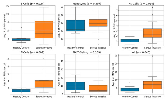 We computed the average number of PNPs per immune cell type for 14 serous invasive ovarian cancer patients and 7 healthy controls. The average number of cells per sample was 2471 cells. Using the Mann–Whitney U-test to establish statistical significance, serous invasive ovarian cancer patients compared to healthy controls showed elevated binding on B cells (p = 0.024), NK cells (p = 0.014) and T cells (p = 0.001) and no significant difference on monocytes (p = 0.397) or NK-T cells (p = 0.109). When comparing all cells regardless of cell lineage, serous invasive ovarian cancer patients showed an elevation of the number of PNPs per cell (p = 0.040). Box plots showing the number of PNPs per cell subtype and for all cells combined are shown in Figure 2. Whiskers represent the data range once outliers are excluded. Outliers are detected as datapoints that are below or above 1.5 times the interquartile range beyond the low and high quartiles, respectively. The average number of PNPs per cell for each cell subtype for serous invasive ovarian cancer patients and healthy controls are shown in Table 2. We have further analyzed the percentage of cells of serous invasive ovarian cancer patients that have low, medium, and high nanoparticle binding. We used cutoff thresholds of 5 and 10 nanoparticles per cell. The results are shown in Supplementary Table S1.