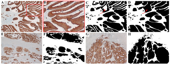 The image preparation process is illustrated in (A–D), starting with a stained image (A); then the intermediary ImageJ output (C); and the final image, which was manually corrected for lumen not filled by the algorithm (D). One such lumen is indicated with an arrow for better visibility. In (B), an enlarged section of (A) with enhanced contrast is shown to illustrate the difference between lumen, denoted by L, and stroma, denoted by S. Note that the cell nuclei in the stroma were stained blue, whereas the lumen remained white. Further shown are images of patients without metastasis (E), with metastasis (G), and the respective binary images fed to the network (F,H). The predicted risk of distant metastasis by BIgCoMet was 9.6% for F (low-risk group) and 85.5% for H (high-risk group).