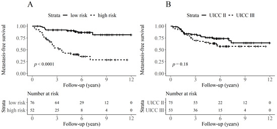 BIg-CoMet was a strong risk factor for the occurrence of distant metastasis, with a hazard ratio for the high-risk group of 6.9 (95% CI: 3.4–14.2, p < 0.001). In particular, in comparison to the UICC staging (Figure 3B), the Kaplan-Meier curves clearly illustrated a strong risk stratification effect (Figure 3A, log-rank-test: p < 0.001).