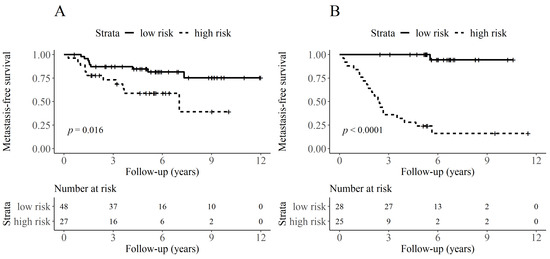 Separate Kaplan–Meier curves for metastasis-free survival for both groups underlined these results. Low- and high-risk groups, defined by BIg-CoMet, differed significantly with regard to the metastasis-free survival for both UICC grades (UICC II: log-rank-test p = 0.016, UICC III: log-rank-test p < 0.001) (Figure 4). The assignment of high-risk by BIg-CoMet was a significant prognostic predictor of the occurrence of distant metastasis in UICC II as well as UICC III cases (UICC II: HR = 2.9, 95% CI: 1.2–7.0, p = 0.021; UICC III: HR = 45.2, 95% CI: 6.0–340.8, p < 0.001).