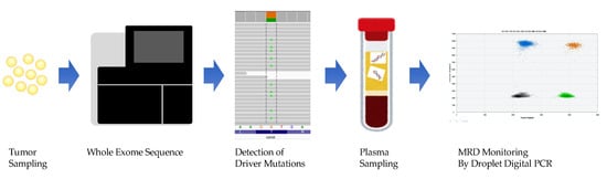 At the time of diagnosis of acute leukemia, 1012 leukemic cells were present in the patient’s body. Even after successful induction therapy and complete morphological remission with less than 5% leukemic cells in the BM on speculum, 109 leukemic cells remained in the body. The number of leukemic cells below 109 undetectable by light microscopy are termed as MRD and are considered important because they can proliferate and cause relapse after remission [79,80,81]. The MRD evaluation method used in clinical practice, qPCR, which detects genetic mutations in bone marrow DNA, has a high sensitivity of 0.1%. However, only patients with gene mutations detectable by commercial-based tests, such as APL (PML-RALα) and CML (BCR-ABL), can benefit from it. Currently, allogeneic hematopoietic stem cell transplantation (alloSCT) [82] is the only curative option for patients with high-risk or refractory AML and MDS. However, many post-alloSCT AML patients experience relapse and suffer another severe disease course [83,84]. In addition, AML patients with positive MRD pre- or post-transplantation have a higher risk of post-transplant recurrence and a lower survival rate [85]. In 2018 and 2019, we developed a ctDNA-based noninvasive MRD monitoring and prognosis system for patients with AML/MDS undergoing alloSCT [86,87]. We retrospectively performed whole-exome sequencing of tumor samples from AML/MDS patients (using the patient oral mucosa cells as a control) to identify driver mutations in the tumors, construct patient-specific ddPCR assays, and monitor MRD with ctDNA obtained from serum at 1 month and 3 months after transplantation (Figure 1). We found that patients who were MRD-positive at 1 month and 3 months after transplantation had an increased relapse rate 3 years after transplantation. We are currently conducting a prospective study of patients with AML/MDS undergoing alloSCT to verify the usefulness and feasibility of MRD monitoring using ctDNA. We will be able to report on this in the near future. In 2020, Nicholas et al. performed targeted NGS of ctDNA and BM DNA in patients with AML and suggested that they may be complementary to the assessment and monitoring of patients [88]. Zhong et al. detected monoclonal immunoglobulin gene rearrangement in AML ctDNA, which is expected to be applied in MRD monitoring [89]. The detection of IgH and TCR rearrangement is common in lymphoid malignancy but rare in AML. As we have shown, MRD monitoring by ddPCR has been used in many studies, but Christenson et al. did not consider it substantial. If the expression of SNPs in the wild-type gene sequence is not taken into account when creating a ddPCR assay, the correct allele frequency may not be detected [90]. In addition, the presence of clonal hematopoiesis with indeterminate potential (CHIP) should be noted in the evaluation of MRD by ctDNA. Clonal hematopoiesis is a condition in which a single or a very small number of clones maintain hematopoiesis. Mutations in epigenomic regulatory genes such as DNMT3A, TET2, and ASXL1 are the most common causes of CHIP [91,92]. It has been reported that the majority of mutations detected in cfDNA of healthy individuals are CHIP, and if these are detected as mutations in ctDNA and subjected to MRD evaluation, the reliability of the test will be reduced [93]. There is an opinion that it is possible to exclude CHIP mutations by paired sequencing of leukocyte DNA and plasma cfDNA [94], but further validation is needed in terms of cost and time. It is hoped that MRD monitoring by ctDNA will be implemented in the clinical environment after repeated trial and error and sufficient validation.