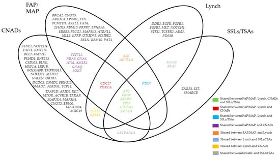 Graphical representation of the most frequent mutated genes in FAP (Familial Adenomatous Polyposis)/MAP (MUTYH-associated Polyposis), Lynch, CNADs (Conventional Colorectal Adenomas) and SSLs (Sessile Serrated Lesions) /TSAs (Traditional Serrated Lesions emerging from the studies discussed in this review. The graph does not refer to any statistics.