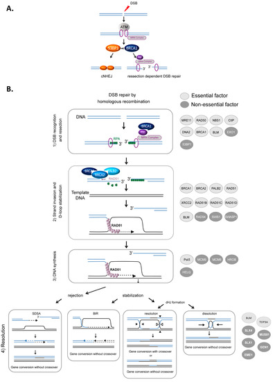 HR-mediated DSB repair. (A). Signaling and competition between cNHEJ and resection [34]. The involvement of 53BP1, BRCA1 and the MRN complex. (B). Model of DSB repair by HR. (1) The MRN complex initiates a 5′ to 3′ resection under the control of BRCA1/CtIP, generating a 3′ single-stranded DNA (ssDNA) (A). (2) RAD51 is then loaded to the 3′ single-stranded DNA by the combined action of BRCA2/PALB2 and BRCA1, resulting in the formation of an ordered RAD51-ssDNA nucleofilament. The invasion of homologous duplex DNA by the RAD51-ssDNA filament induces the formation of a displacement loop (D-loop). (3) The invading strand primes DNA synthesis. (4) The D-loop can be either dismantled, leading to DSB repair by synthesis-dependent strand annealing (SDSA) or stabilized, leading to either DSB repair by BIR or the formation of a double Holliday junction (dHJ). The dHJ can be resolved or dissolved, leading to a repair product either associated with a crossover event or not. The proteins involved in each corresponding step are listed on the right side of the figure. Light gray circles indicate essential factors; essential factors are defined as genes whose knockout leads to embryonic lethality in mice. Dark gray circles indicate nonessential factors; these are genes whose KO does not lead to embryonic lethality in mice.