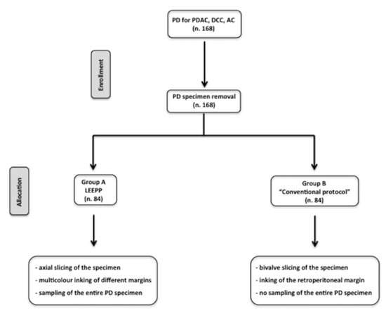 After PD was performed, a computer-generated randomization was used to allocate PD specimens to two different methods of pathological evaluation: the LEEPP (group A) or a conventional protocol which was already used by each participating center (group B) (Figure 1).