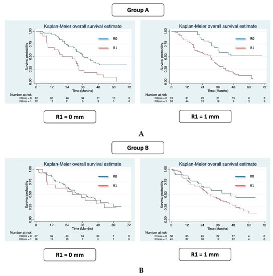 Figure 4A shows the OS Kaplan–Meier curves according to R status for each study group and for each clearance (0 and 1 mm). For group A, the median OS was 36 (31–46) months for R0 and 20 (9–33) months for R1 (HR 2.35; p = 0.007) using 0 mm clearance. When adopting 1 mm clearance, the median OS was not reached for R0 and was 30 (18–34) months (HR 3.55; p = 0.005) for R1 (Figure 4A).