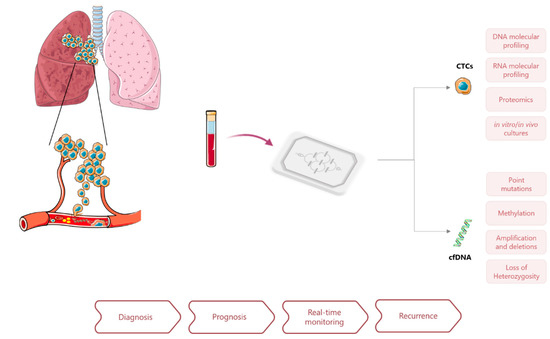 Microfluidic devices have been introduced in the field of liquid biopsies as a strategy to improve biomarkers separation, capture, and characterization (Figure 1). Advances in integrated microfluidics platforms have made possible the miniaturization of analytical techniques on-chip to enable accurate and high-throughput assays in a more automated manner. Other advantages relate to the low-cost of their production, the precise control of working parameters, closed architectures that prevent sample loss and operation with low volumes, and reduced use of reagents and waste production. Lab-on-a-chip approaches to liquid biopsy have shown promising applications for disease monitoring and genetic characterization of LCa in a minimally invasive way and with minute sample requirements [13,14,15,16].
