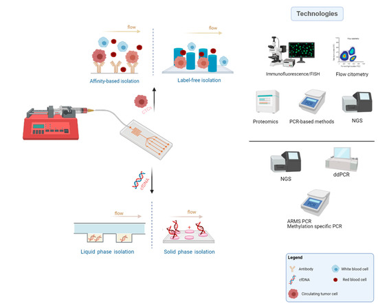 Common microfluidics methodology, main principles applied for CTCs and cfDNA isolation and typical technologies used for the biomarkers characterization (Created with BioRender.com).