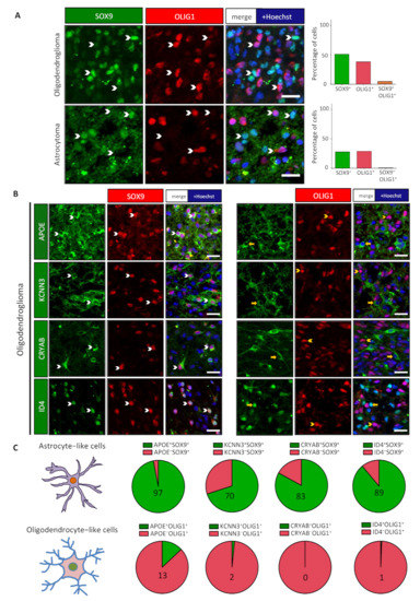 To ascertain that SOX9+ cells show some astrocytic features, further stainings were performed. We selected proteins that are expressed in diffuse low-grade gliomas, for which literature and database analyses (Figure S1A,B and Table S2) show a clear preferential expression in the astrocytic lineage. We chose APOE, ID4, KCNN3 astrocytic proteins, for which reliable antibodies were used in combination with OLIG1 and SOX9 transcription factors. We also analyzed the expression of CRYAB (alpha-B crystallin) as this protein was described to be elevated up to 22-fold in IDH1-mutant gliomas [25]. Stainings for these four proteins were performed in one oligodendroglioma and one astrocytoma mutated for IDH1, along with 1p/19q codeletion or ATRX mutation, respecttively. Results presented in Figure 1B,C (oligodendroglioma) and Figure S3 (astrocytoma) show that the expression of these four proteins is more associated with SOX9+ cells than OLIG1+ cells.